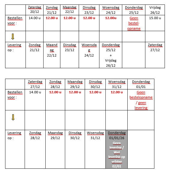 Gelieve er rekening mee te houden dat verpakkingen enkel uitgeleverd worden op dinsdag, woensdag, donderdag en vrijdag.